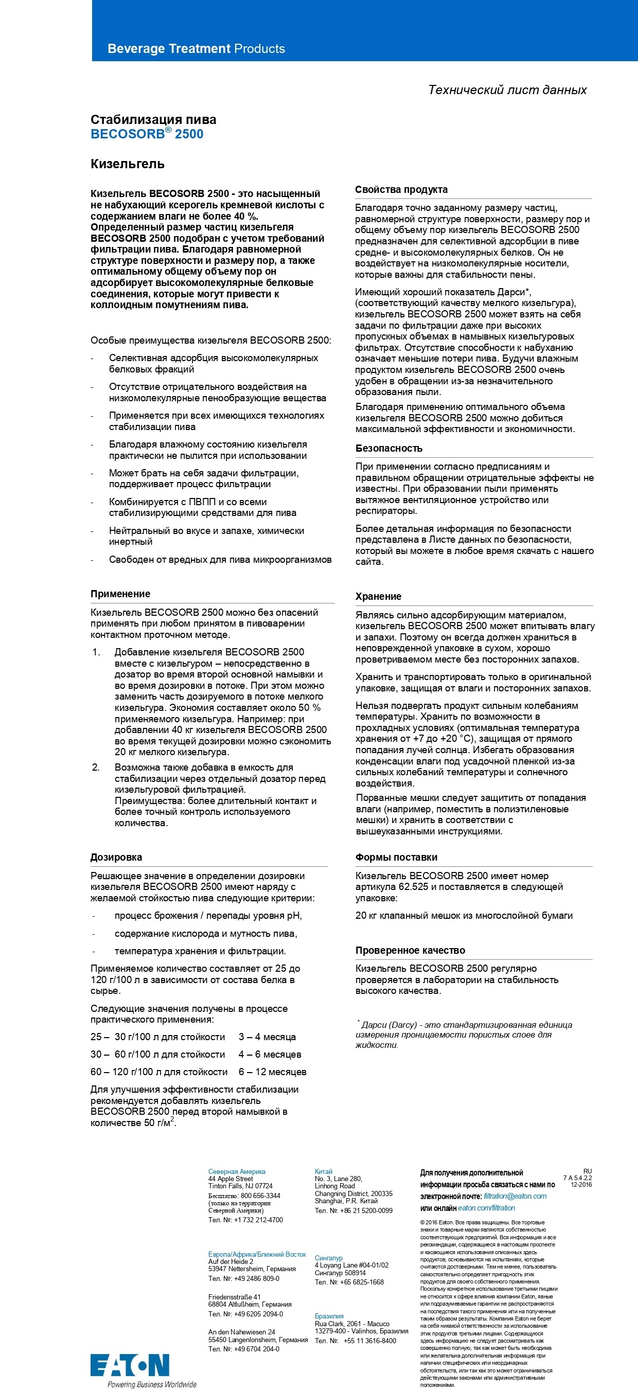Определенный размер частиц кизельгеля BECOSORB 2500 подобран с учетом требований фильтрации пива. Благодаря равномерной структуре поверхности и размеру пор, а также оптимальному общему объему пор он адсорбирует высокомолекулярные белковые соединения, которые могут привести к коллоидным помутнениям пива.